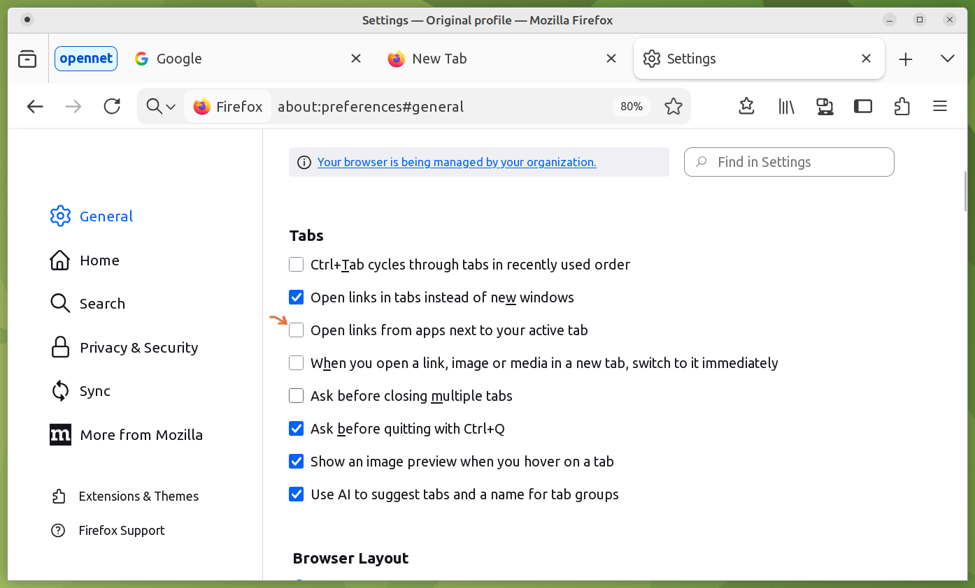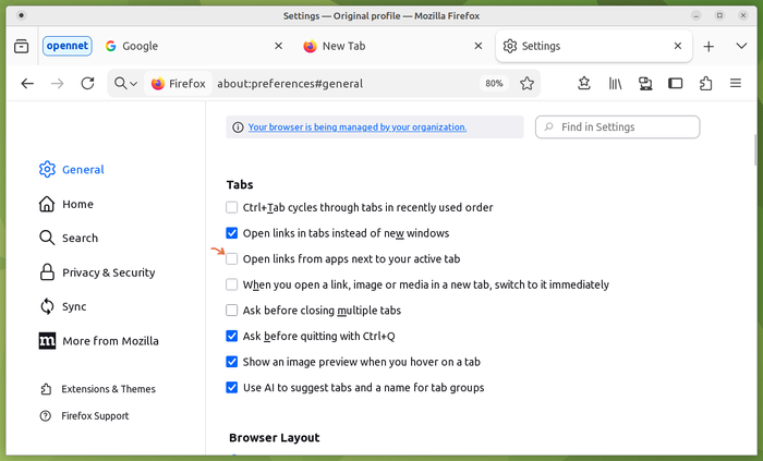 В настройки вкладок добавлена опция для размещения вкладки, создаваемой при открытии ссылок из внешних приложений, рядом с текущей активной вкладкой, а не в конце списка вкладок.