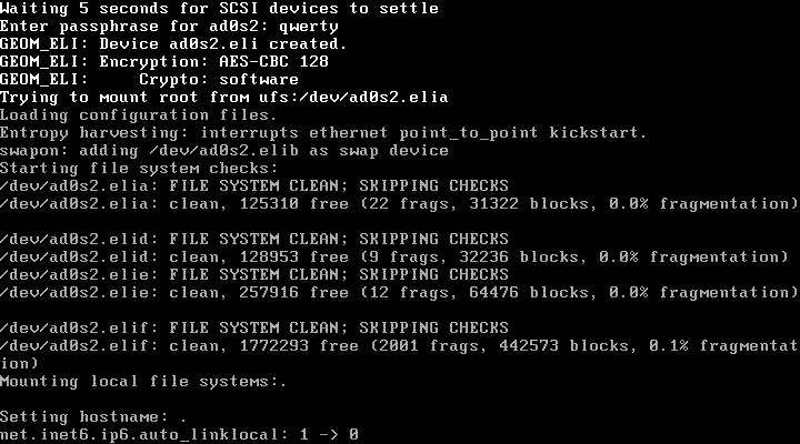 P.S. Пароль будет спрошен в момент загрузки ядра, как только прогрузится geli и сразу перед монтированием корневой ФС (там картинка специально приложена).