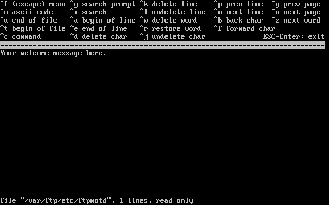 This is a text editor called ee. Use the instructions to change the message or change the message later using a text editor of your choice. Note the file name/location at the bottom of the editor screen.