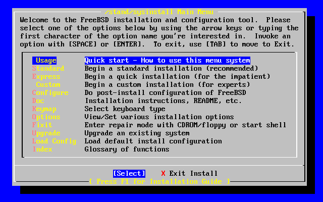 Answer Y to save the parameters and the probing will start. After displaying the probe results in white on black text Sysinstall will start and display its main menu (Figure 2-5).