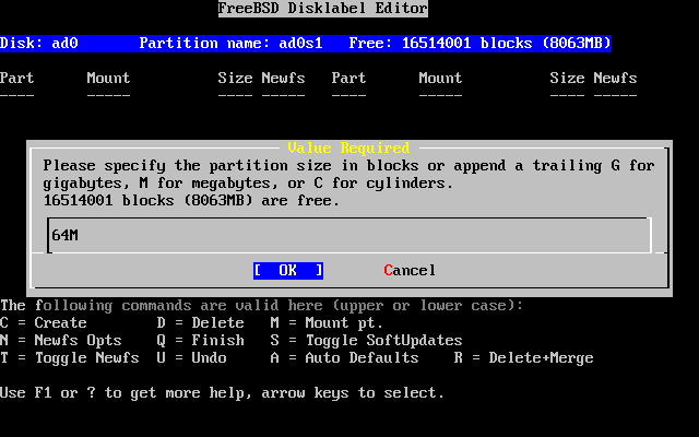 If you have already made space for FreeBSD (perhaps by using a tool such as Partition Magic) then you can press C to create a new slice. Again, you will be prompted for the size of slice you would like to create.