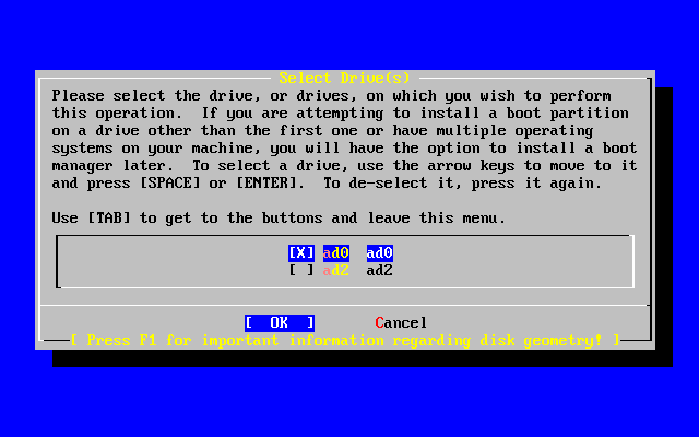 The Tab key toggles between the last drive selected, [ OK ], and [ Cancel ].