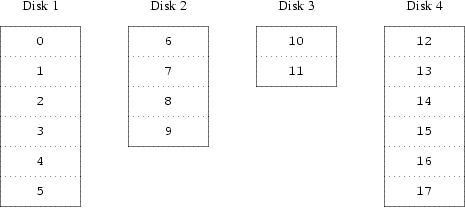 An alternative mapping is to divide the address space into smaller, equal-sized components and store them sequentially on different devices. For example, the first 256 sectors may be stored on the first disk, the next 256 sectors on the next disk and so on. After filling the last disk, the process repeats until the disks are full. This mapping is called striping or RAID-0 [1]. Striping requires somewhat more effort to locate the data, and it can cause additional I/O load where a transfer is spread over multiple disks, but it can also provide a more constant load across the disks. Figure 13-2 illustrates the sequence in which storage units are allocated in a striped organization.