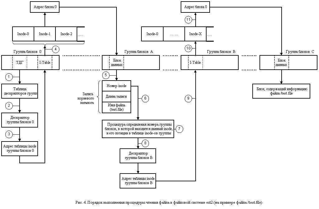 В нашем примере, в целях упрощения, мы ограничили объем данных, которые мы можем считать из файла, первыми 12-ю блоками (прямые ссылки, см. рис. 3). Поэтому, перед тем как прочитать файл, необходимо проверить, чтобы размер запрашиваемых данных (num) и смещение в файле (seek) не превысили установленные границы: