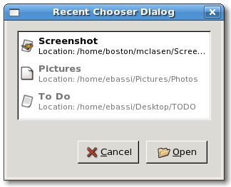 GtkWidget *dialog; dialog = gtk_recent_chooser_dialog_new ("Recent Documents", parent_window, GTK_STOCK_CANCEL, GTK_RESPONSE_CANCEL, GTK_STOCK_OPEN, GTK_RESPONSE_ACCEPT, NULL); if (gtk_dialog_run (GTK_DIALOG (dialog)) == GTK_RESPONSE_ACCEPT) { GtkRecentInfo *info; info = gtk_recent_chooser_get_current_item (GTK_RECENT_CHOOSER (dialog)); open_file (gtk_recent_info_get_uri (info)); gtk_recent_info_unref (info); } gtk_widget_destroy (dialog);