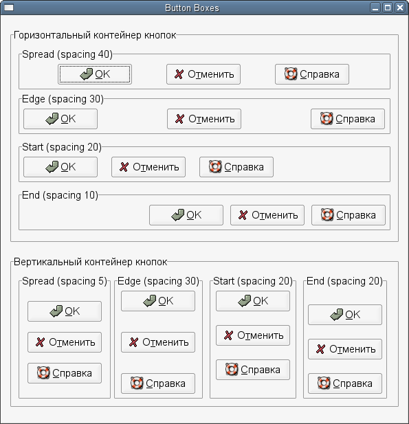 Контейнеры кнопок позволяют быстро размещать группы кнопок с горизонтальным или вертикальным положением. Для создания контейнеров кнопок используются функции: