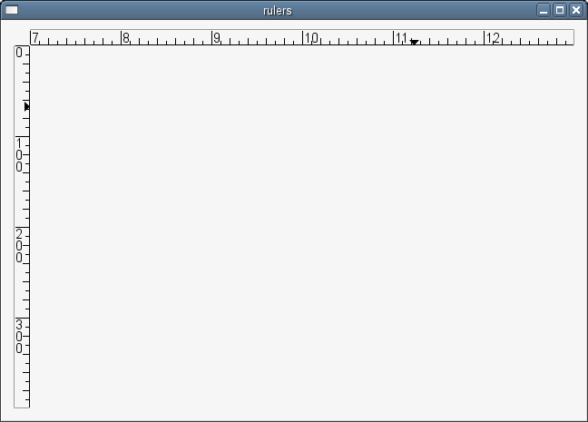 В следующем примере создаётся окно с горизонтальной линейкой вверху и вертикальной слева. Размер полотна определен в 600 пикселей ширины и 400 высоты. Горизонтальная линейка охватывает от 7 до 13 единиц, с маркировкой через каждые 10 pixels, а вертикальная линейка охватывает от 0 до 400 единиц, с маркировкой через каждые 100 pixels. Размещение полотна и линеек в окне выполнено с использованием таблицы.