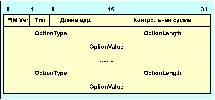 Рис. 4.4.9.5.5. Формат кодированного адреса отправителя Поле бит s (бит рассеянности) содержит 1 для PIM-SM. Этот бит используется для обеспечения совместимости с PIM v.1. Поле бит W (бит WC). Бит WC =1, если подключение (join) или удаление (prune) используются для маршрутной записи (*,g) или (*,*,rp). Если wc=0, join или prune используются для маршрутной записи (s,g), где s - адрес отправителя. Сообщения join и prune, посылаемые в RP, должны иметь этот бит равным 1. Поле бит R (бит RPT). Бит RPT=1, если информация о (s,g) послана в RP. Если RPT=0, информация должна быть послана S, где S - адрес отправителя. Поле длина маски имеет длину 8 бит. Значение этого поля охарактеризовано выше в комментарии к рисунку 4.4.9.5.4. Поле адрес отправителя имеет длину, определяемую полем заголовка длина адреса. Для IPv4, она равна 4 октетам. Формат сообщения Hello показан на рис. 4.4.9.5.6. Первые два байта представляют собой заголовок PIM-сообщения. Поле optiontype определяет тип опции, значение которой задано в поле optionvalue. Поле optionlength задает длину поля optionvalue в байтах. Поле optionvalue имеет переменную длину и содержит значение опции. Поле опция может содержать следующие значения: