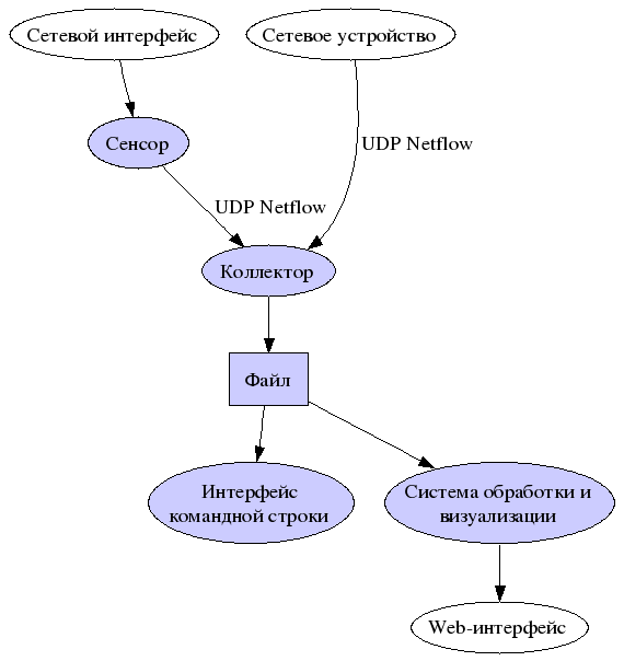 В качестве каждого из элементов системы может использоваться несколько разных вариантов программ. Список доступного программного обеспечения, предназначенного для работы с NetFlow приведен ниже.