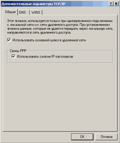 Указание IP и/или DNS вручную абсолютно ничего не меняет, если pppd сконфигурирован предоставлять адреса клиентам, стоит убедиться лишь, что в окне «Дополнительные параметры TCP/IP», зарытом глубже в свойствах, отмечены опции «Использовать основной шлюз в удаленной сети» и «Использовать сжатие IP-заголовков»: