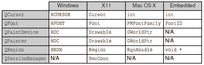 Некоторые классы, такие как QWidget, QPixmap, QPrinter и QPicture, ведут свою родословную от класса QPaintDevice. В X11 и Mac OS X, handle() означает то же самое самое, что и winId() класса QWidget. В Windows функция handle() возвращает контекст устройства, в то время как winId() -- дескриптор окна. Похожим образом, функция hbm(), класса QPixmap, в среде Windows, возвращает дескриптор растра (HBITMAP).