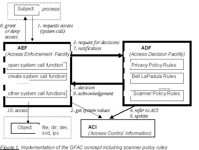 В нашей Linux-реализации GFAC (которую мы назвали RSBAC: "Rule-Set Based Access Control"), система контроля доступа ядра разделена на ADF- и AEF-компоненты и модуль ACI, который управляет Access Control Information (ACI, например, атрибуты безопасности) являющимся центральным хранилищем атрибутов безопасности в системе. Схема 1 демонстрирует взаимодействие между компонентами системы. Для каждого уместного, с точки зрения безопасности, системного вызова (если субъект желает получить доступ к объекту) AEF направляет запрос решения к ADF. Параметрами для запроса решения являются тип запроса, описывающий желаемый тип функциональности, идентификацию вызывающего процесса и, по возможности, идентификатор цели доступа (субъект или объект). ADF оценивает политику защиты при помощи правил политики для типа запроса и для этих правил необходим ACI. Если затем оценивается его мета-политика, то используются решения различных политик защиты для окончательного определения запроса процесса. Затем AEF реализует решение либо выполнением функций системного вызова, либо возвратив вызывающему процессу сообщение об ошибке. В первом случае, после успешного выполнения, ADF получает уведомление, в следствие чего атрибуты могут быть приведены в соответствие. И наконец, контроль возвращается к процессу.