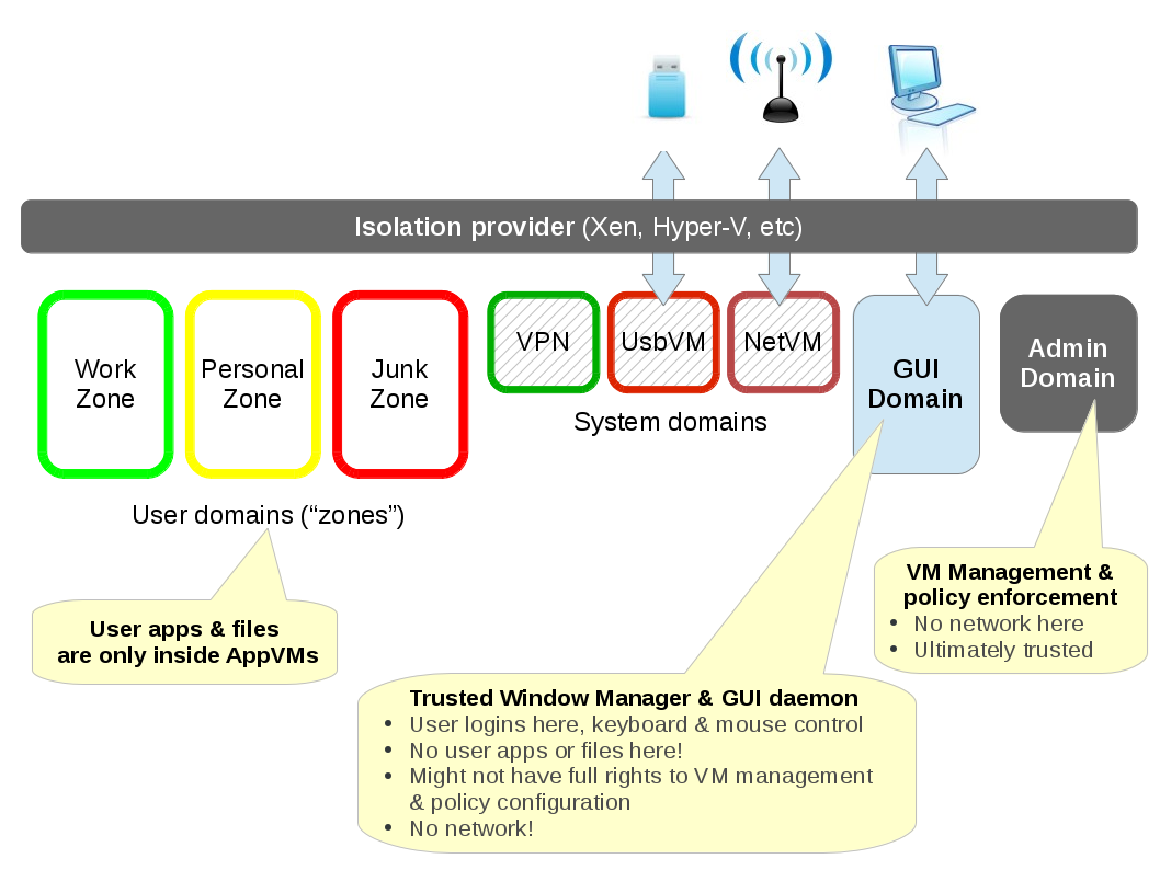 Йоанна Рутковская (http://ru.wikipedia.org/wiki/%D0%A0%D1%8...) (Joanna Rutkowska) представила (http://blog.invisiblethings.org/2015/10/01/qubes-30.html) выпуск операционной системы Qubes 3.0 (https://wiki.qubes-os.org), реализующей идею (https://www.opennet.dev/opennews/art.shtml?num=34732) использования гипервизора для строгой изоляции приложений и компонентов ОС (каждый класс приложений и системные сервисы работают в отдельных виртуальных машинах). Для загрузки подготовлены (https://www.qubes-os.org/downloads/) установочный DVD (3.7 Гб) и экспериментальный Live USB. Для работы необходима (https://www.qubes-os.org/hcl/) система с 4 Гб ОЗУ и 64-разрядным CPU Intel или AMD, желательно с поддержкой технологий VT-x/AMD-v и VT-d/AMD IOMMU. | ||