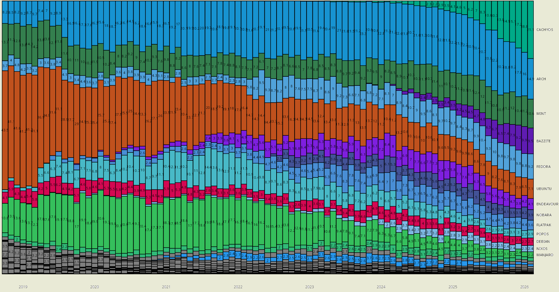 Наибольшую долю среди Linux систем занимает платформа SteamOS Holo, основанная на Arch Linux - 24.48%. Доля Linux Mint составляет 8.8%, Arch Linux - 8.78%, Ubuntu - 5.25%, Manjaro - 1.45%. По сравнению с февральской статистикой из списка пропали дистрибутивы CachyOS и Bazitte, доля которых составляла 8.59% и 5.79%, соответственно. В мартовском рейтинге также отсутствует упоминание Freedesktop SDK (Flatpak runtime), доля которого составляла 5.26%. При этом в мартовских данных появились системы с именами "64 bit" и "0 64 bit", доля которых составляет 8.01% и 17.60% (!). Можно предположить, что это Bazitte и CachyOS, но столь значительное увеличение доли каждой из данных систем выглядит сомнительно. ![]() Мартовская статистика от проекта Boiling Steam, собранная на основе данных из сервиса ProtonDB, демонстрирует значительный рост популярности дистрибутивов Bazitte и CachyOS, наблюдаемый с прошло года. В марте CachyOS вырвался на первое месте среди дистрибутивов Linux, применяемых геймерами, заняв долю 21.1% и сместив с первого места Arch Linux, который удерживал данную позицию с 2021 года. Доля Bazitte составила 9.5%, что соответствует 4 месту. Для сравнения, доля Arch Linux - 14.9%, Linux Mint - 10.6%, Fedora - 9.2%, Ubuntu - 7.1%, Endeavour - 4.1%, Nobara - 3.9%, PopOS - 2.9%, Debian - 2.7%, NixOS - 2.4%, Manjaro - 2.2%. Суммарная доля всех дистрибутивов на базе Arch Linux составила 42.3%, на базе Debian - 23.3%, на базе Fedora - 22.6%. ![]() Дистрибутив CachyOS основан на пакетной базе Arch Linux и примечателен включением оптимизаций для повышения производительности, а также формированием сборки для носимых устройств (Handheld Edition) с интерфейсом в стиле GameMode и компонентами для любителей компьютерных игр. В дистрибутиве по умолчанию включён планировщик задач BORE, оптимизированный для снижения задержек на рабочем столе и повышения приоритета интерактивных процессов. Ядро и пакеты собраны с включением LTO-оптимизаций (Link-Time Optimization) и задействованием инструкций, доступных в процессорах на базе микроархитектур x86-64-v3, x86-64-v4 и Zen4. При сборке базовых пакетов дополнительно включены оптимизации PGO (Profile-Guided Optimization) или BOLT (Binary Optimization and Layout Tool). Дистрибутив Bazitte ориентирован на геймеров и основан на наработках дистрибутивов Fedora Kinoite и Fedora Silverblue. (атомарно обновляемые редакции Fedora Linux с рабочими столами KDE и GNOME). Дистрибутив поставляется в форме монолитного образа, не разделяемого на отдельные пакеты и обновляемого как единое целое. Приложения устанавливаются в формате Flatpak или в форме контейнров. Для запуска Android-игр задействован Waydroid. В состав входит Steam и подборка компонентов, востребованных любителями компьютерных игр, а также дополнительные драйверы для игровых контроллеров и Wi-Fi. В системные компоненты внесены оптимизации для повышения отзывчивости и улучшения поддержки HDR и VRR. Доля Linux по данным из других источников: