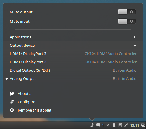 Апплеты на скринах клевые, особенно переключение звуковых устройств прямо с панели. Еще бы переключатель монитор/телек аналогичный, было бы мне счастье. А то иногда подключаю наушники через hdmi-моник и телек через второй выход, приходится в куче меню лазить в кедах, для звука особенно. Что ли попробовать на минт перекатиться с кубунточки.