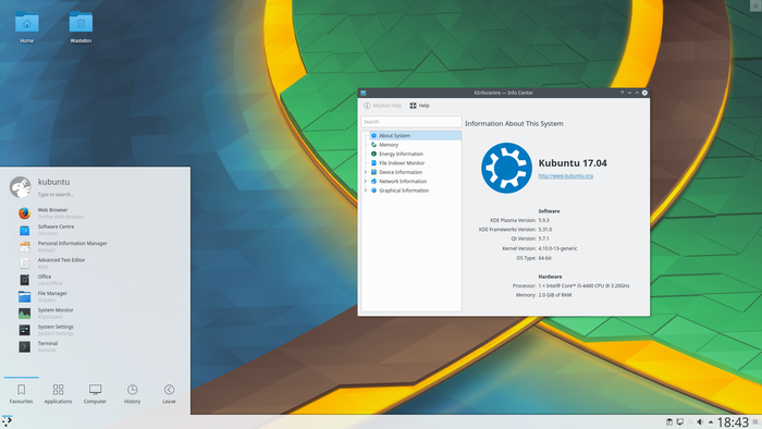 • Kubuntu: Рабочий стол обновлён до KDE Plasma 5.9, библиотеки до KDE Frameworks 5.31, а набор приложений до KDE Applications 16.12.3 (за исключением KDE PIM, который оставлен на версии 6.04.3). По умолчанию задействован режим Folder View. Задействованы варианты офисного пакета Calligra (3.0.1), просмотрщика документов Okular и программы для записи оптических дисков K3B, переведённые на Qt5 и технологии KDE 5.