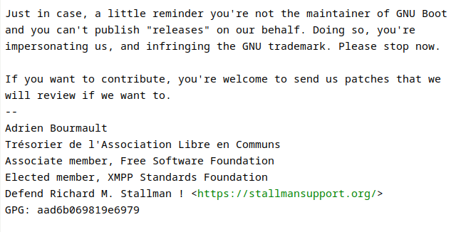 Адриан Бурмо (Adrien Bourmault), основатель проекта GNU Boot, направил Лии Роу (Leah Rowe), развивающей дистрибутив Libreboot, требование прекратить использование имени GNU Boot для распространения своей сборки. Две недели назад Лия опубликовала урезанную сборку Libreboot под именем GNU Boot, снабдив её пометкой "неофициальная". В претензии указано, что Лия не является мэйнтейнером GNU Boot и не имеет права публиковать релизы от имени данного проекта. При желании участвовать в разработке следовало прислать патчи для рецензирования, а не создавать свой релиз.