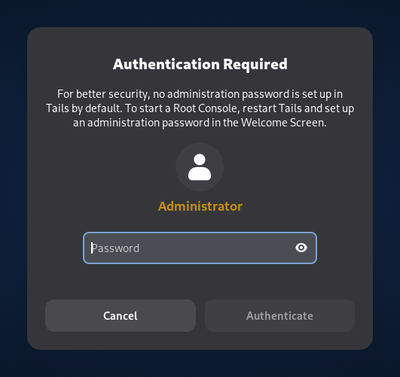 • Диалог ввода пароля перед запуском приложений, требующих прав администратора, теперь отдельно информирует пользователя о том, что пароль администратора не был выставлен на странице входа в систему (Welcome Screen).
