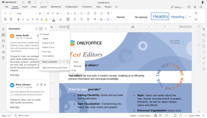 Естественно не такая мощная, как у MS Office или Google Docs, так как у них и бюджеты космические, но тем не менее.