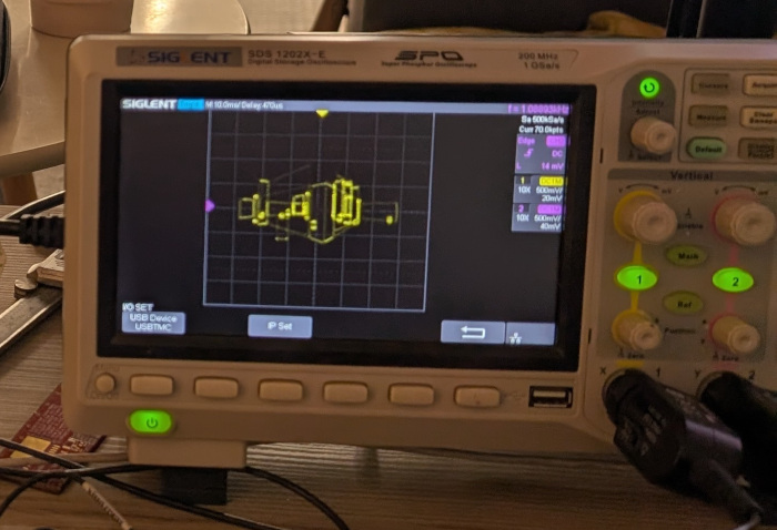 Порт ScopeDoom генерирует картинку на осциллографе, работающем в режиме X-Y, используя звуковую карту в качестве двухканального цифрового аналогового преобразователя. Режим X-Y реализует векторный дисплей, координаты для которого по оси X передаются через канал осциллографа CH1, а по оси Y - через CH2. Для генерации векторных данных задействован код вышеописанной реализации KiDoom и Python-скрипт для преобразования координат и их передачи в форме звуковых сигналов. Частота обновления кадров при таком подходе упирается в частоту дискретизация звука и составляет 4-8 кадров в секунду.