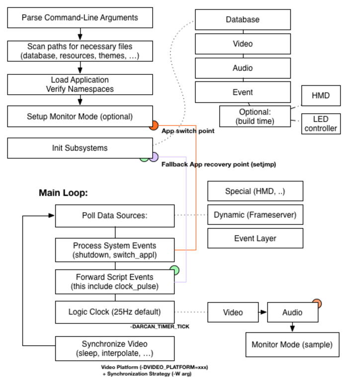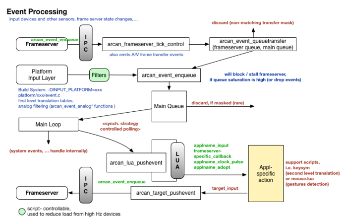 В качестве ключевых критериев, применяемых при проектировании API Arcan, упоминаются безопасность, производительность и пригодность для отладки. Для упрощения разработки интерфейсов предлагается использовать язык Lua.