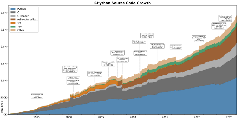 Интересно получается - развитие идет практически линейно уже третий десяток лет. Но с 2023 года разработка языка пошла заметно быстрее/объемнее. Что это - опять ИИ помог? Или избавление от GIL потребовало мега-усилий?