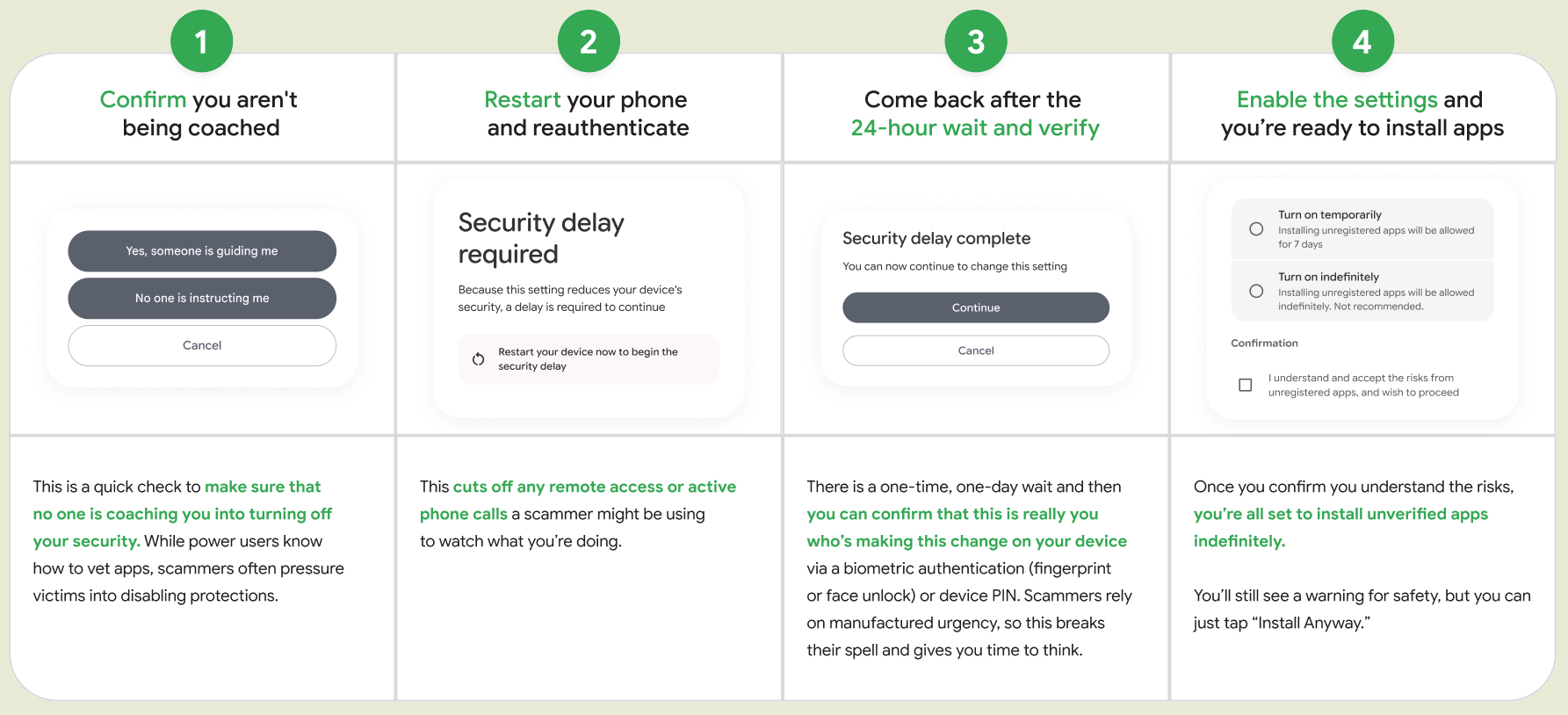 >Возможность установки вручную загруженного пакета будет активирована через 24 часа, что даст пользователю время на осознание ситуации, если он находится по влиянием мошенников. Через 24 часа пользователь должен повторно зайти в настройки и подтвердить, что он сознательно активировал режим для установки сторонний пакетов, используя PIN-код или биометрическую аутентификацию.