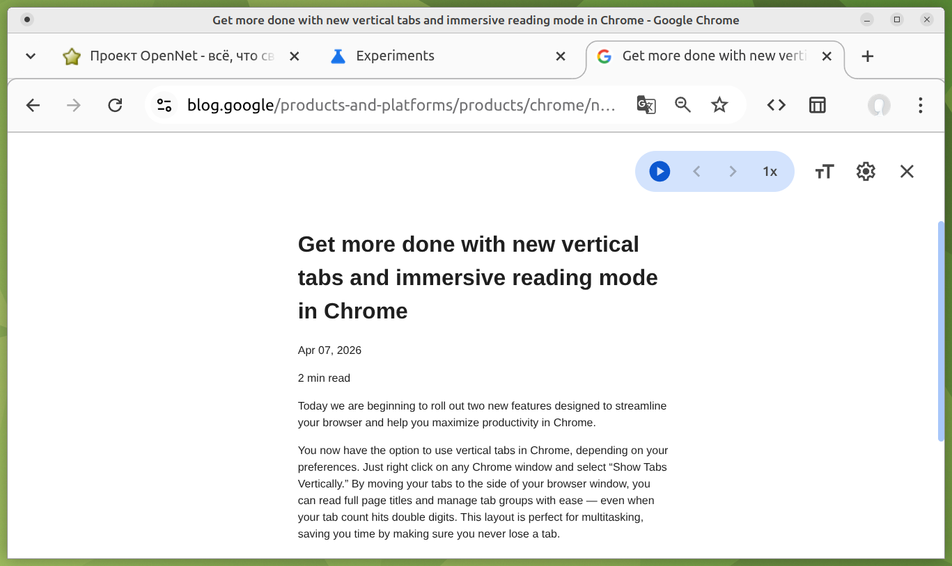 - Переработан режим чтения (reading mode), при котором отображается только значимый текст страницы, а все сопутствующие управляющие элементы, баннеры, меню, навигационные панели и прочие не связанные с контентом части страницы скрываются. В новой версии по аналогии с Firefox значимое содержимое показывается во всей видимой области, а не как раньше в узком боковом окне рядом с исходной страницей. Если новый режим не применяется по умолчанию, его можно активировать через настройку "chrome://flags/#read-anything-immersive-reading-mode".