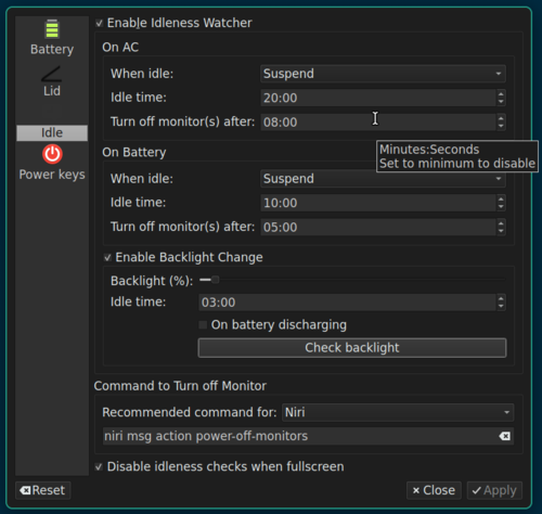 >В LXQt-Powermanagement реализованы раздельные таймауты перевода монитора в спящий режим для автономной работы и для работы от стационарного источника энергии.