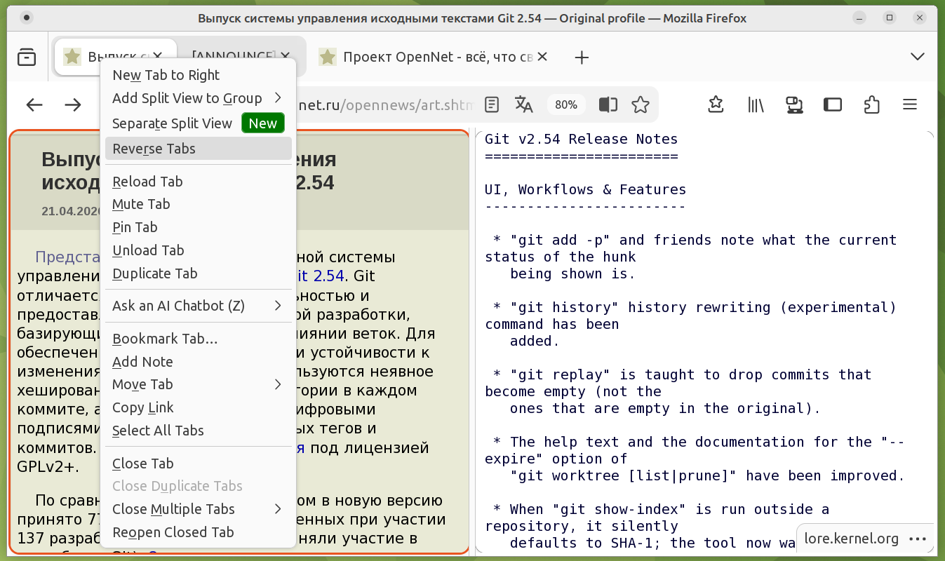 Firefox 149.0.2, kwin_wayland, вертикальная раскладка. Нажатие ESC отменяет операцию, мгновенно возвращая вкладку на своё место. Но только если курсор над любой из боковых панелей